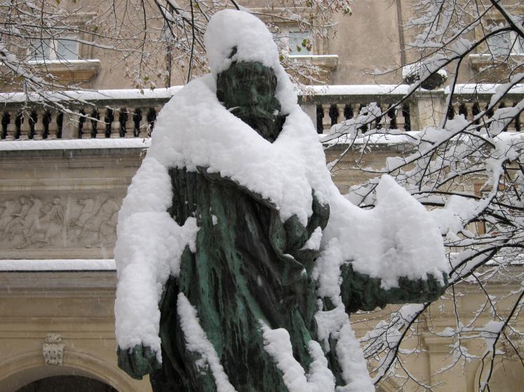 Legendre-Héral, sculpteur lyonnais du XIXe siècle, s’est attaché à représenter cet épisode de la vie de Giotto. Si vous cherchez un peu, vous verrez sûrement une référence au talent de l’enfant esquissée sur la base de l’œuvre. On doit également à Legendre-Héral l’effigie d’Henri IV en haut-relief qui orne la façade de l’Hôtel de ville côté place des Terreaux.
