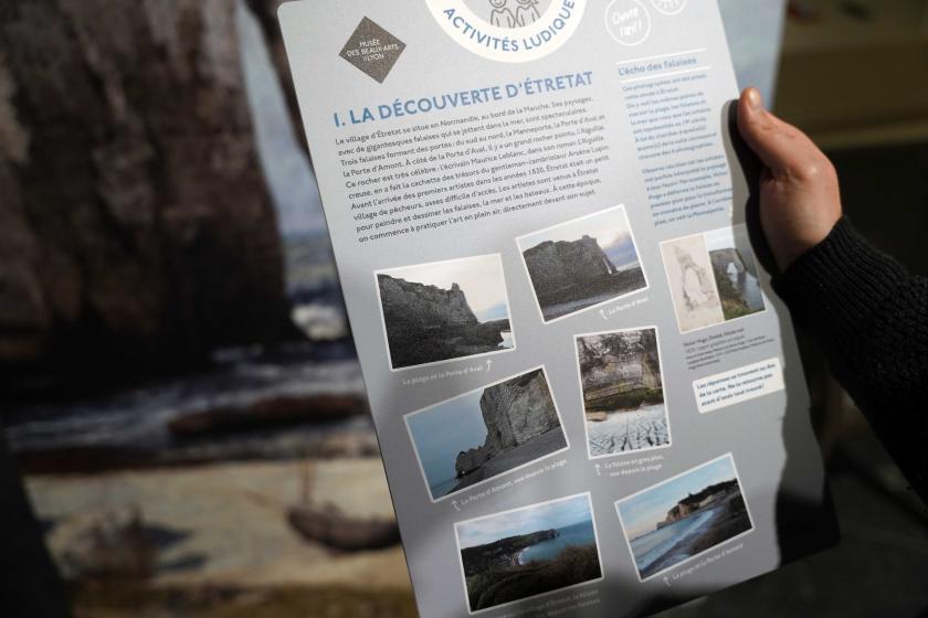 Les murmures de la mer / L’écho des falaises / Ouvre l’œil : Étretat à la loupe / Trésors marins au creux de la main / L’énigme d’Étretat / Essences marines / Mille et une falaises / Palettes marines... Tout au long du parcours, des propositions et expérimentations variées pour découvrir l’exposition à hauteur d’enfant : boîtes sensorielles, puzzles, fiches de salles et même un parfum pour sentir l’odeur iodée des vagues déchaînées…