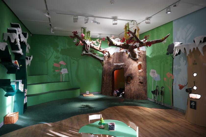 Venez dessiner, jouer, toucher, sentir, vous déguiser: les œuvres vous transportent dans l’univers de la forêt magnifié par les artistes. Retrouvez un coloriage géant, des puzzles, un memory, un jeu des 7 familles, déguisez-vous et posez devant des reproductions d’œuvres XXL. Un arbre-cabane vous invite à la lecture et au partage dans un environnement calme. La vue sur le jardin vous plonge dans la cime des arbres. Des jeux de découverte sensorielle autour du toucher, de l’odorat, de la vue vous apprennent à mieux connaître les œuvres en bois du musée.