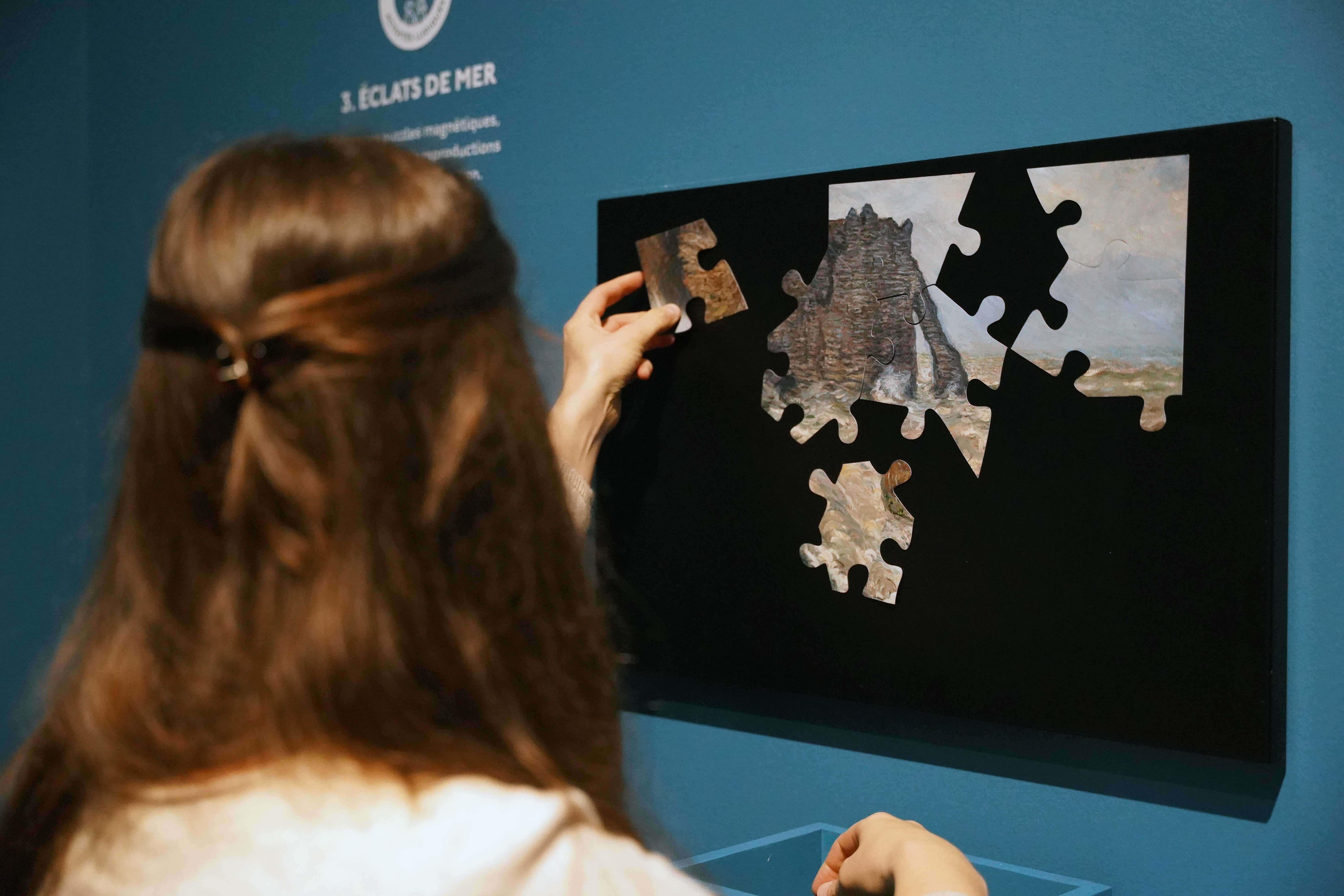 Les murmures de la mer / L’écho des falaises / Ouvre l’œil : Étretat à la loupe / Trésors marins au creux de la main / L’énigme d’Étretat / Essences marines / Mille et une falaises / Palettes marines... Tout au long du parcours, des propositions et expérimentations variées pour découvrir l’exposition à hauteur d’enfant : boîtes sensorielles, puzzles, fiches de salles et même un parfum pour sentir l’odeur iodée des vagues déchaînées…